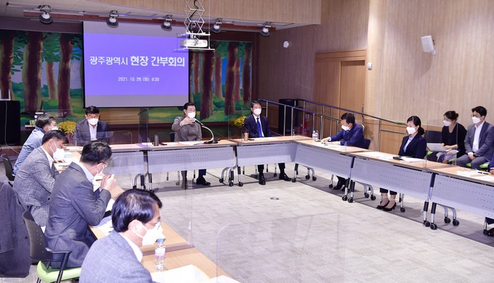 광주시에 따르면 중앙공원 내 어린이생태도서관에서 진행된 현장간부회의에는 시 본청 실국장 이상 간부 12명이 참석했으며, 민간공원 추진사항 및 쟁점 보고 및 논의, 이용섭 시장의 당부, 결의, 현장 확인 등의 순으로 진행됐다.
