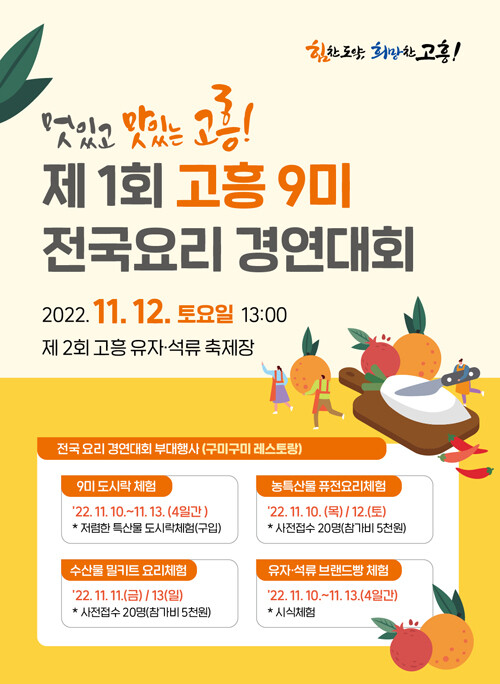 [세계로컬타임즈 조주연 기자] 전남 고흥군이 “오는 11월 12일 ‘제1회 고흥 9味 전국요리 경연대회’를 개최한다”고 13일 밝혔다.