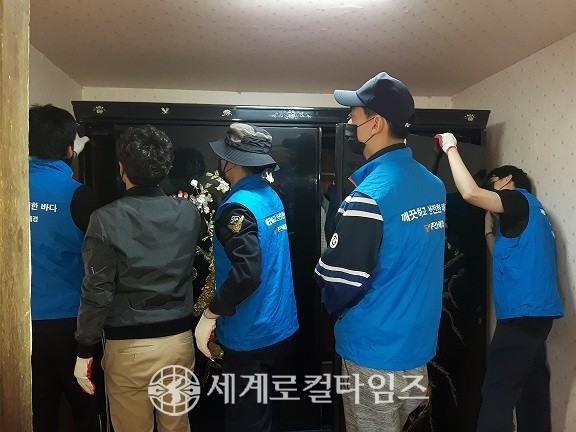 부안군에 따르면 이번 봉사활동은 희망복지지원단의 통합사례관리 민간자원 서비스 연계를 통해 부안해양경찰서, 부안노인복지센터, 부안클린케어 등이 참여해 집안의 찌든 때와 침구와 의류 정리 및 실내외 소독을 실시, 어르신이 깔끔하고 쾌적하게 생활할 수 있도록 했다.