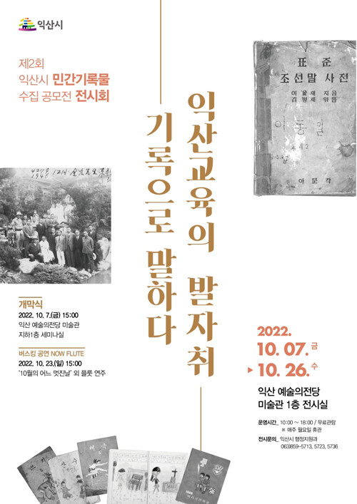 전시회는 공모전의 기획주제인 ‘익산의 교육’을 제1테마로 교과서, 앨범 등으로 전시됐다. 제2테마는 ‘익산의 문화’로 익산의 역사, 종교, 문중 및 인물 기록이다. 제3테마는 ‘익산의 생활’로 양로당 및 동계 자료, 일기 및 생활상, 생활도구 등을 만나 볼 수 있다.