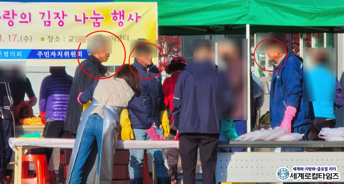 | ▲17일 오전, 김제시 교** 행정복지센터 주차장에서 마스크를 착용하지 않은 사람들이 김치를 버무리고 있다. |