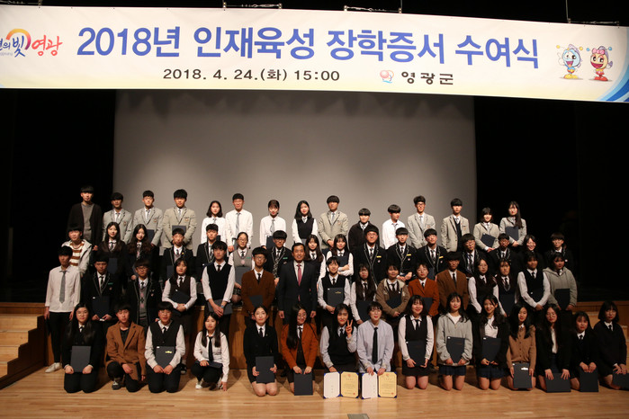 [세계로컬신문 이남규 기자] 전남 영광군(군수 권한대행 김명원)은 24일 영광 예술의 전당 대공연장에서 관내 초·중·고등학생과 대학생, 교사, 학교장, 학부모 등 300여명이 참석한 가운데 2018년 영광군 인재육성 장학증서 전달식을 개최했다.