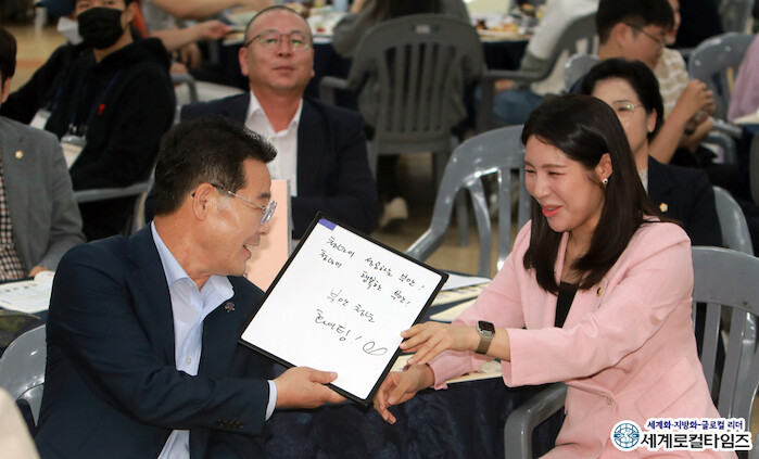[세계로컬타임즈 글·사진 조주연 기자] 20일 오후, 전북 부안예술회관에서 열린 ‘2023 부안 청년포럼’에 참석한 권익현 부안군수가 단체사진 촬영에 앞서 김슬지 전북도의원에게 메세지판을 건네고 있다.