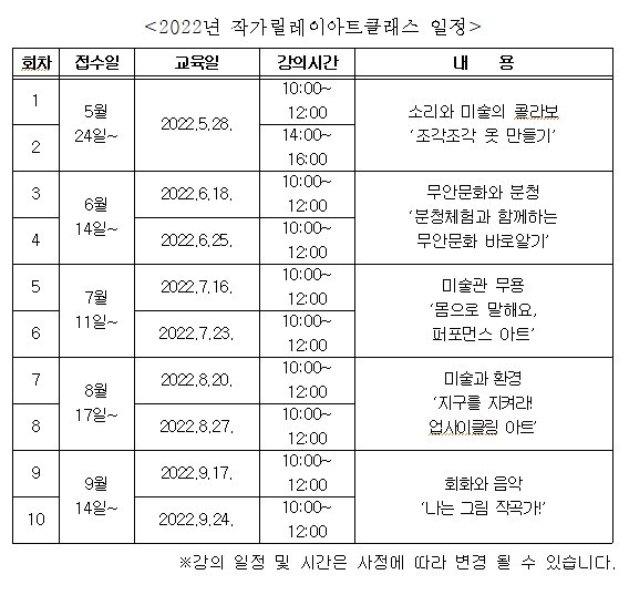 매주 토요일 2시간 동안 운영되는 작가릴레이 아트클래스는 현재 활발히 활동하고 있는 저명한 미술작가와 각 분야의 전문 강사를 초빙해 그동안 미술수업과는 다른 음악, 무용, 역사, 환경 등을 미술과 접목시키는 창의적인 융‧복합 미술교육 프로그램으로 관내 어린이들에게 수준 높은 예술교육을 제공할 예정이다.