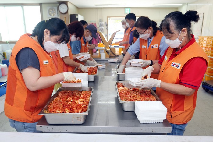| ▲ 안산시자원봉사센터회원들과-IBK기업은행직원들이 사랑의 반찬 봉사를 하고 있다.(사진=안산시) |