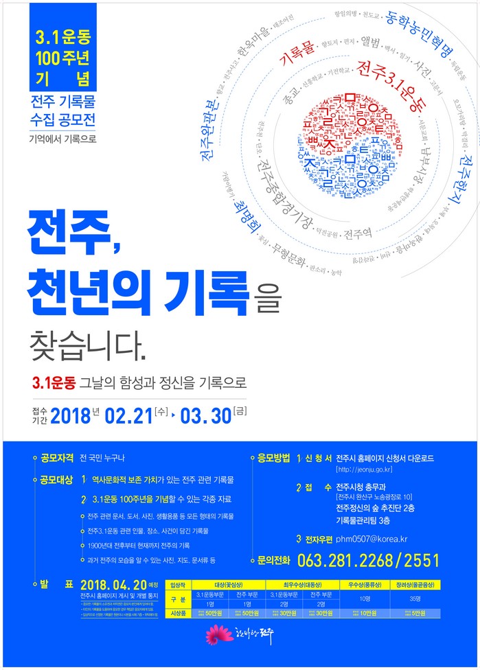 전주시는 "3.1운동 100주년 기념사업의 일원으로 오는 21일부터 3월 30일까지 전주의 3.1운동의 역사성과 도시의 생활상이 담긴 기록물, 3.1운동을 포함한 독립운동 관련 자료(기념식, 재현행사, 학술자료 등 광복 이후 활동자료 포함), 역사·문화적 보존 가치가 뛰어난 전주 관련 기록물 등을 모으는 ‘2018 전주 기록물 수집 공모전’을 개최한다"고 19일 밝혔다.