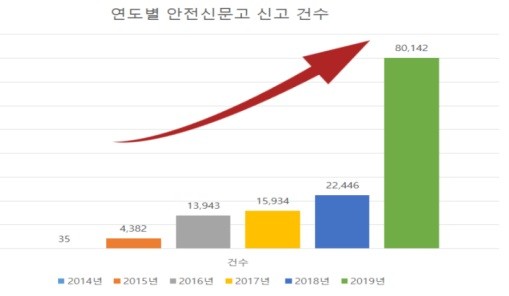서비스를 개시한 2014년 9월 30일 이후 지금까지 대구시의 안전신문고 신고 건수는 모두 18만여 건이 접수됐다. 연도별로는 2014년 35건 · 2015년 4,382건 · 2016년 13,943건 · 2017년 15,934건 · 2018년 22,446건 · 2019년 80,142건으로 매년 증가 추세다.