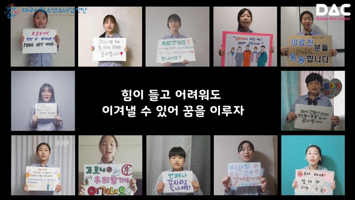 최현묵 대구시 문화예술회관 관장은 “코로나19로 인해 몸과 마음이 많이 지쳐있는 이때 아이들이 전하는 순수한 응원의 메시지가 다시금 일어설 수 있는 원동력이 되었으면 한다”고 전했다.