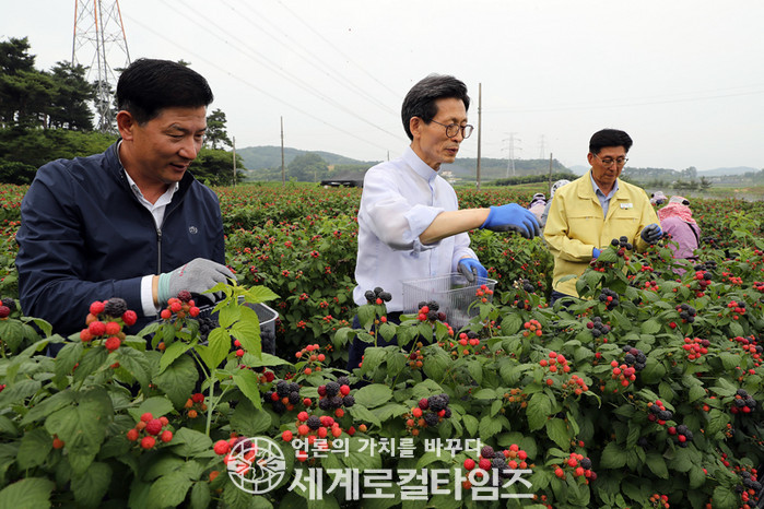 | ▲복분자를 수확하는 유기상(가운데) 고창군수 모습(사진제공=고창군) |