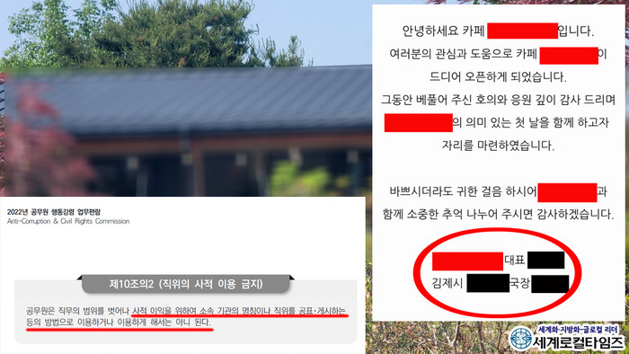 | ▲김제시 A국장의 아들이 개업한 카페, 공무원 행동강령, 김제시 A 국장이 직원들에게 보낸 초대장 |