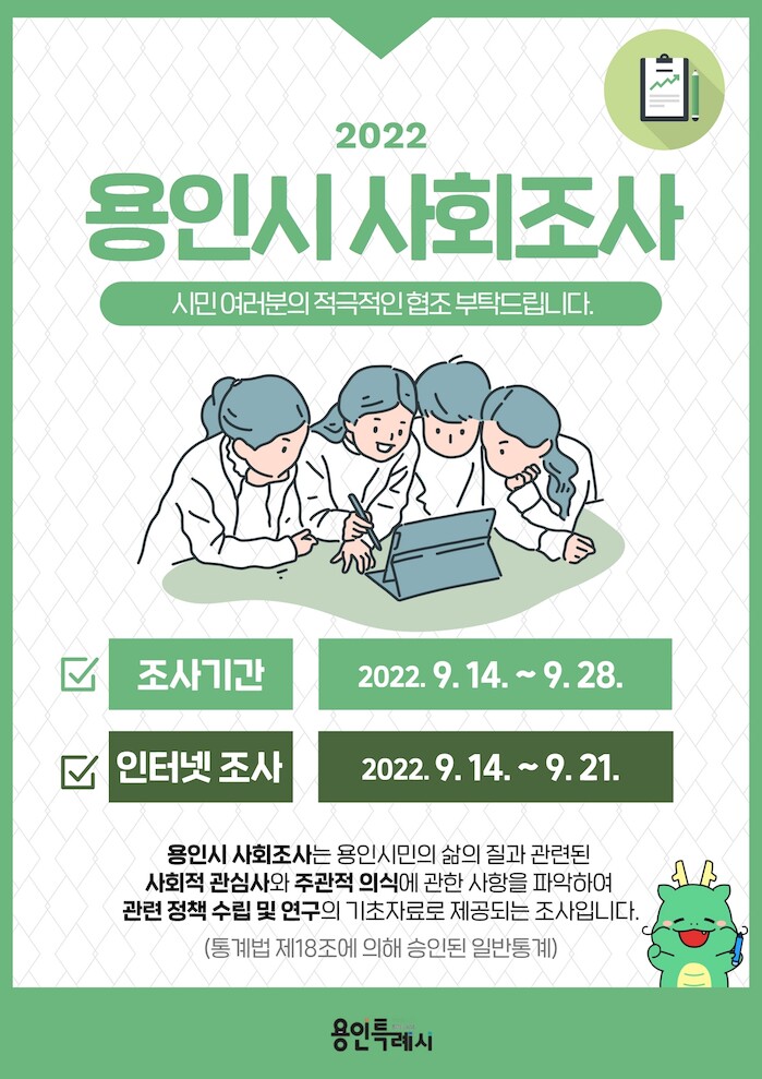 조사 결과는 오는 12월 시 홈페이지 ‘용인통계’를 통해 공표되며 보고서로도 발간될 예정이다.
