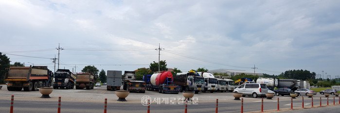 | ▲ 27일 오전 9시 30분, 김제시민운동장 입구 주차장에 전날과 같은 화물차들이 주차돼 있다. |