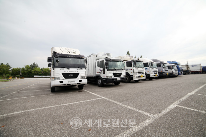 | ▲ 25일 오후 김제시민운동장 입구 주차장이 화물차 주차장이라고 해도 무방할 만큼 종류별 화물차로 가득하다. |