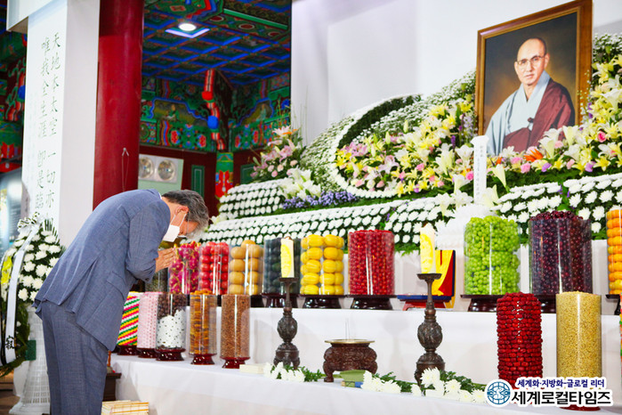 [세계로컬타임즈 글·사진 조주연 기자] 유진섭 전북 정읍시장이 25일 오후 김제 금산사 처영문화기념관에 마련된 태공당 월주 대종사 빈소를 찾아 조문하고 있다. 지난 22일 입적한 태공당 월주 대종사의 영결식은 오늘(26일) 10시 김제 금산사에서 엄수된다.