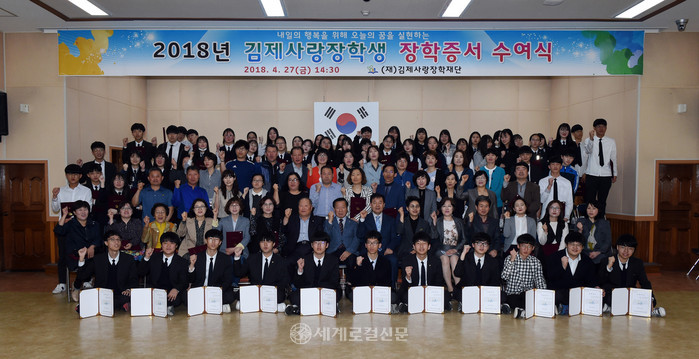 전북 김제시청 3층 대회의실에서 진행된 2018년도 김제사랑장학생 장학증서 수여식은 이후천 재단 이사장권한대행을 비롯한 장학재단 임원, 장학생 및 학부모등 180여명이 참석했으며 일반장학생(고등학생 51명, 대학생 59명) 110명, 예체기능 장학생 2명, 다문화가정자녀 장학생 3명, 이통장자녀 장학생 6명에게 증서가 전달됐다.