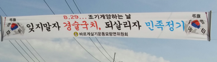 | ▲ 전남 영광군 묘량면에 경술 국치일 조기달기 홍보 현수막이 걸려 있다. |