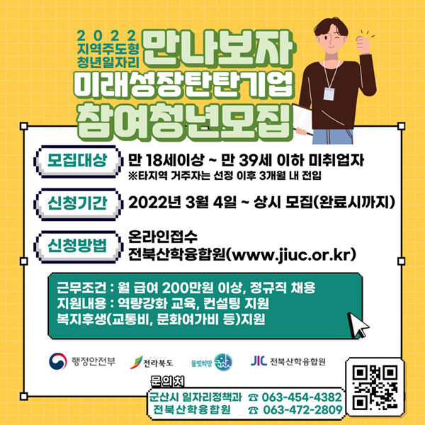 5일 군산시에 따르면 ‘만나보자 미래성장 탄탄기업 사업’은 행정안전부 지역주도형 청년일자리사업으로 지역 특화 정규직 일자리를 지원하는 사업이다. 참여 청년들은 군산시 소재 중견·중소기업체의 기술개발 관련 연구 직무, 마케팅·생산관리·기획 등의 정규직으로 일하게 된다.