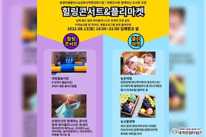 [세계로컬타임즈 조주연 기자] 전북 김제시가 생생마을 플러스 사업으로 ‘유명인사와 함께하는 힐링 콘서트’를 오는 13일 김제향교 광장에서 개최한다.