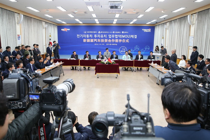 | ▲ 경주시,경북도, 중국장쑤젠캉자동차유한공사,에디슨모터스는 전기자동차 투자유치 업무 협약을 체결하고 있다. (사진=경주시 제공) |