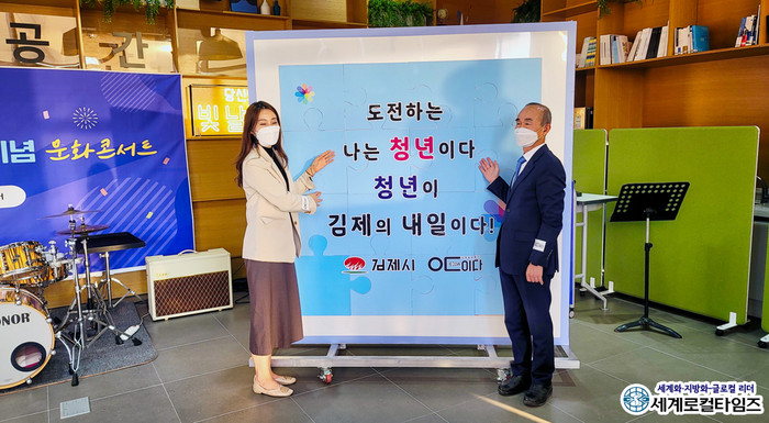 [세계로컬타임즈 글·사진 조주연 기자] 박준배 전북 김제시장이 28일 김제청년공간 ‘이다’ 1주년 행사에 참석해 청년 슬로건 퍼즐 퍼포먼스를 가진 뒤 포즈를 취하고 있다.