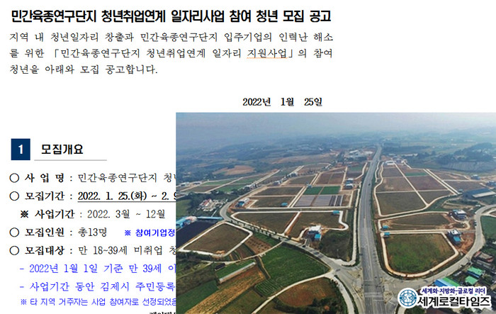 [세계로컬타임즈 조주연 기자] 전북 김제시가 민간육종연구단지 내 종자기업의 인력난 해소를 위한 지역주도형 청년일자리 사업을 추진하고 있는 가운데 참여자를 모집한다.