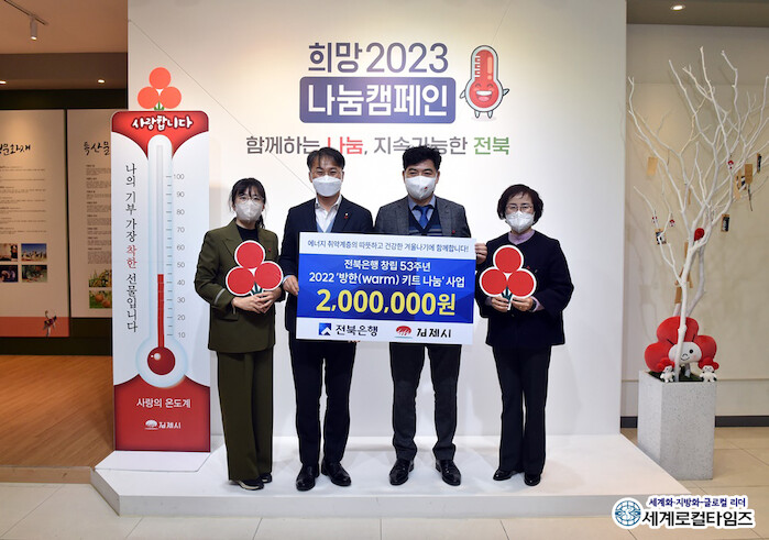 15일 김제시에 따르면 지난 14일 전북은행은 저소득 가정을 위해 써달라며 담요, 수면 바지 등이 포함된 방한키트를 지원하며 ‘희망2023 나눔캠페인’에 동참했다.