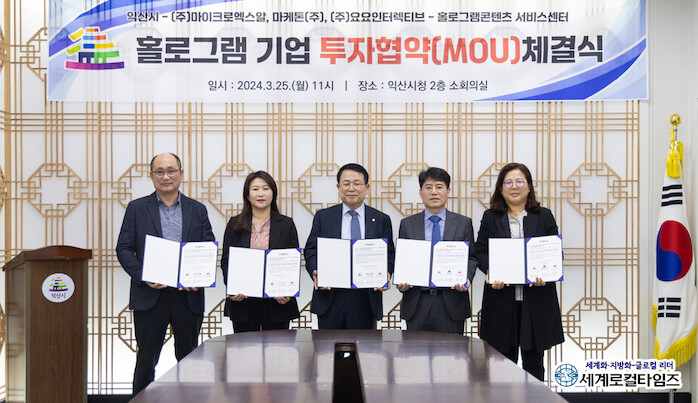 [세계로컬타임즈 조주연 기자] 전북 익산시가 ㈜마이크로엑스알, 마케톤㈜, ㈜요요인터렉티브 등 3개 홀로그램 기업과 지난 25일 투자협약을 체결했다.