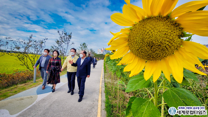 [세계로컬타임즈 글·사진 조주연 기자] 전북 익산 유천생태습지 산책로에 해바라기 꽃길이 조성됐다.
