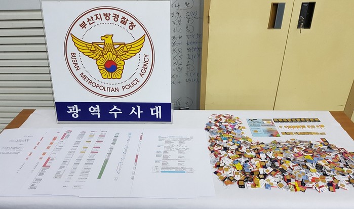 | ▲부산경찰청이 증거물로 압수한 선불유심 가입신청서와 유심칩들.(사진제공=부산지방경찰청) |