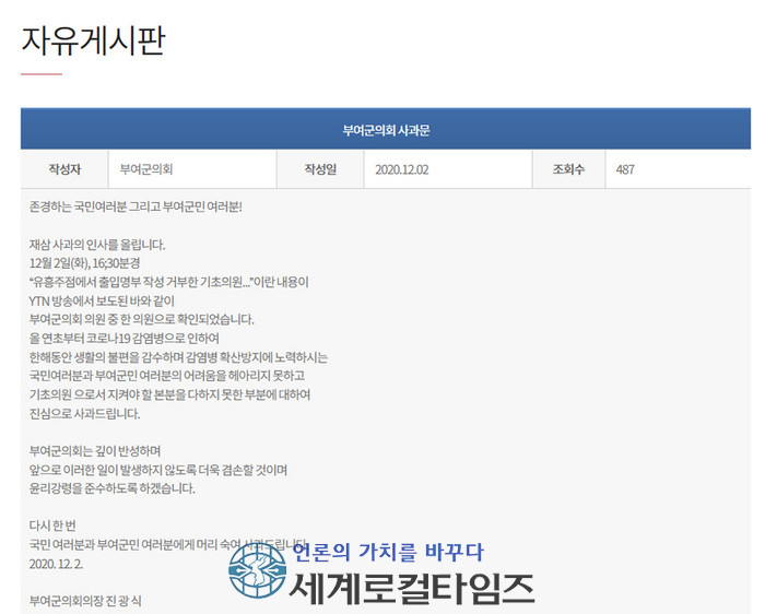 진광식 의장은 의회 홈페이지에 “재삼 사과의 인사를 올린다”며 “유흥주점에서 출입명부 작성 거부한 기초의원이 부여군의회 의원 중 한 의원으로 확인됐다”고 전했다.