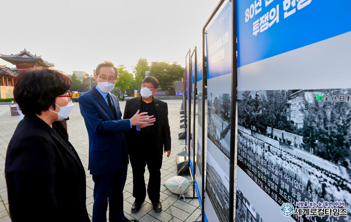 [세계로컬타임즈 조주연 기자] 송하진 전북도지사가 18일 전주 풍남문광장에서 김완술 5·18구속부상자회 전북지부장과 5·18민주화운동 및 미얀마 민주화운동 사진전을 관람하고 있다.