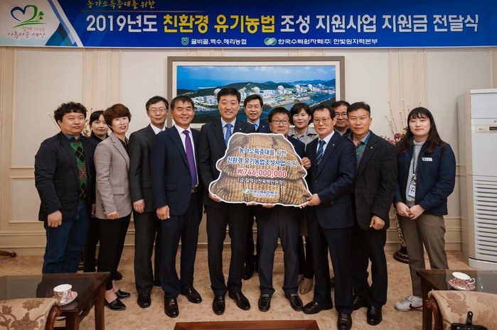 ▲ 27일 한빛원자력본부에서는 굴비골.백수.상하 농협에 2019년도 친환경 유기농법 조성 지원사업 지원금 전달식을 갖고 , 지원금 7억4천6백만원을 전달했다. (사진=한빛본부 제공) . |
