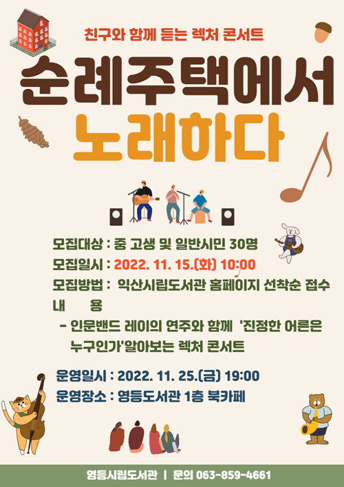 익산시에 따르면 인문밴드 레이와 함께하는 ‘순례주택에서 노래하다’라는 타이틀로 이달 25일 오후 7시 영등도서관 1층 북카페에서 열린다.