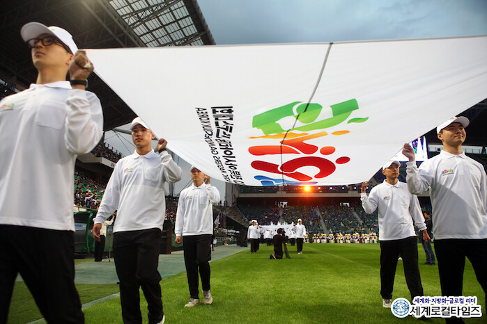[세계로컬타임즈 글·사진 조주연 기자] 지난 13일 ‘2023 전북 아시아태평양 마스터스 대회’ 개회식이 진행되고 있는 전주월드컵경기장에서 대회기가 입장하고 있다. ‘2023 전북 아태마스터스 대회’는 오는 20일까지 전북 일원에서 펼쳐진다.