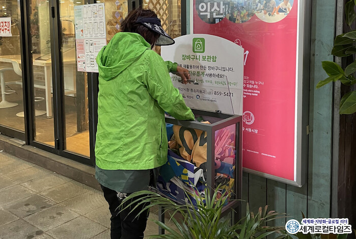 24일 익산시에 따르면 이달부터 폐현수막으로 만든 장바구니를 중앙, 매일, 서동시장, 3곳에 보관함과 함께 비치해 시민들 누구나 무료로 이용할 수 있다.