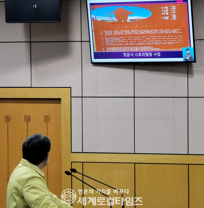| ▲9일 시정답변에 나선 유진섭 정읍시장이 모니터를 통해 정읍사공원 내 스토리텔링 조형물을 보고 있다. |