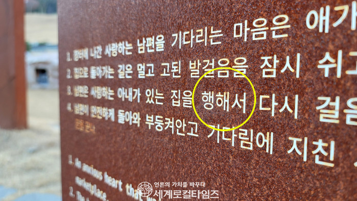 정읍시가 지역 대표 문화 자원 ‘정읍사’의 상징성과 함께 창의적인 스토리를 발굴하기 위해 1억원이 넘는 사업비를 들인 사업 속 조형물에 새겨진 내용인 만큼 그 문장과 표현은 중요할 수 밖에 없다.