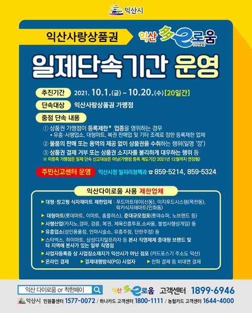 단 익산다이로움 미등록 가맹점은 2021년 12월까지 가맹점 등록 계도기간이 연장됨에 따라 금번 일제 단속에서 제외된다.