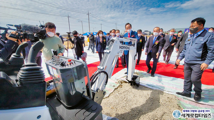 | ▲2021년 4월 2일 송하진 전북도지사와 박준배 김제시장이 전기 굴착기를 둘러보고 있다. (세계로컬타임즈 DB) |