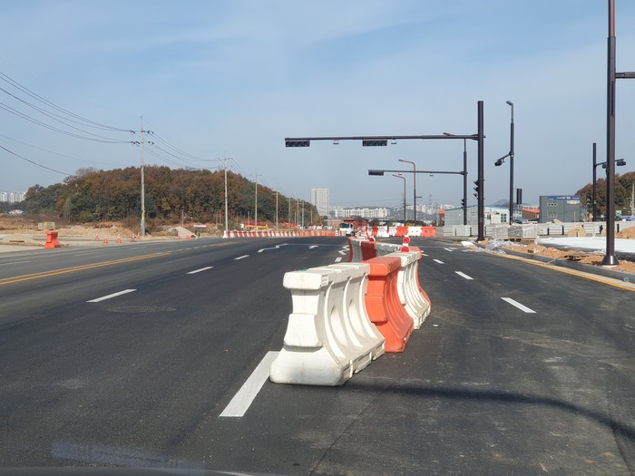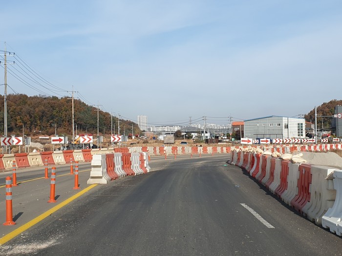 구도로와 신도로가 맞물리면서 도로 경계선이 새로 정해지는 과정에 임시 도로 안전 시설물이 설치돼 있다.