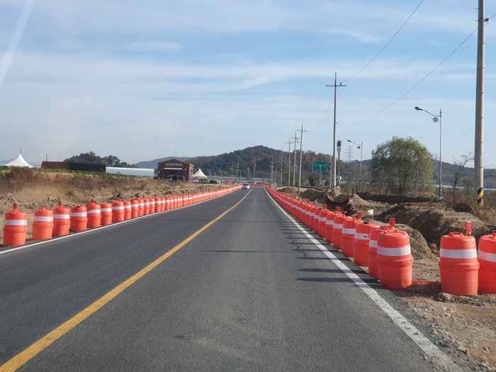 화성시 비봉면 삼화리 1299-1번지부터 매송면 야목리 166-1번지까지 이어지는 3.1km 구간인 ‘시도69호선 도로확포장공사’ 현장을 둘러보면 도로안전용품인 PE 드럼이 촘촘하고 가지런하게 설치돼있다.