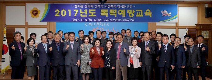 | ▲2017년도 폭력예방교육에서 대전시의원을 비롯해 의회사무처 전 직원이 참석한 가운데 기념촬영을 하고 있다. <사진제공= 대전시의회> |