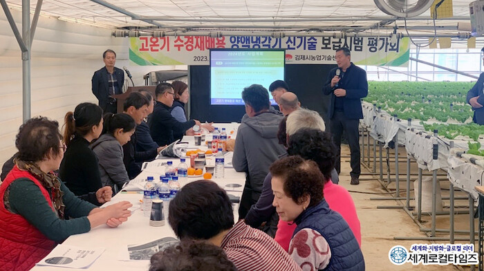 24일 김제시에 따르면 지난 23일 시범 농가에서 진행된 평가회는 이상고온에 대응한 작물 재배 환경 개선을 통한 생산성 향상, 스마트농업을 통한 농작업 편의성 제고 및 노동력 절감으로 농가소득이 상승한 시범사업 성과를 발표하고 공유하는 시간으로 채워졌다.