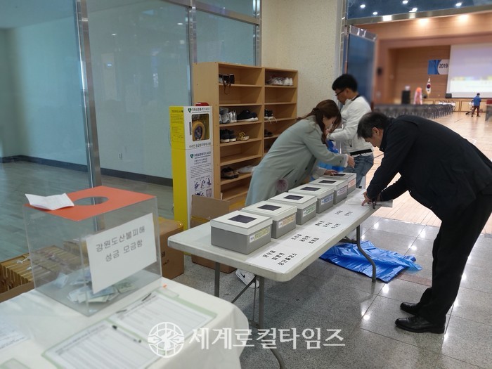 | ▲ 강원도 산불 피해 지역 주민 지원 동참을 위한 모금함이 설치되고 있다. (사진=추현욱 기자) |
