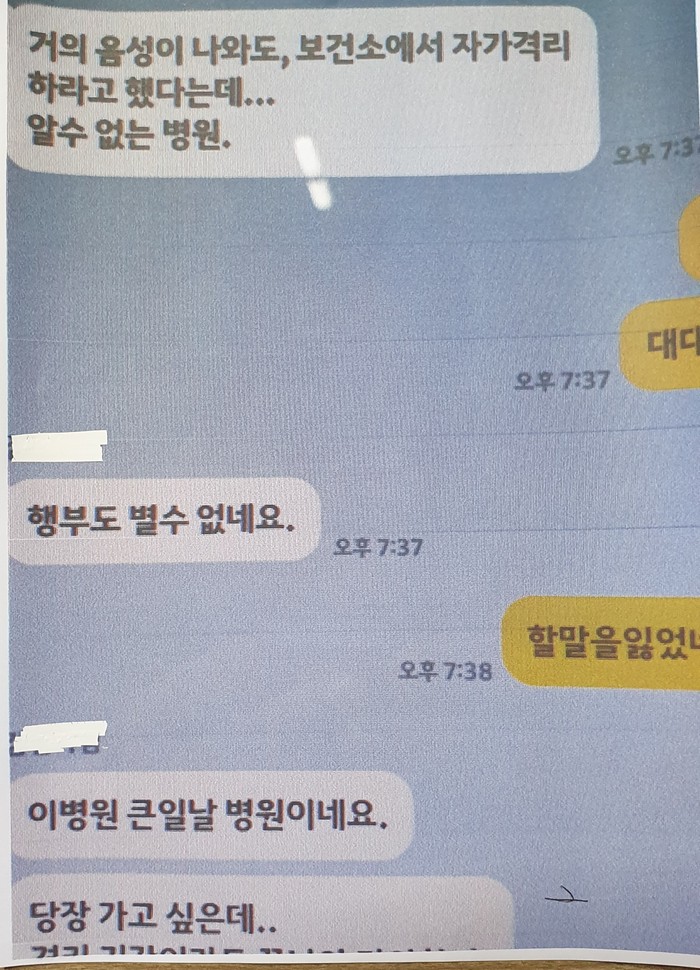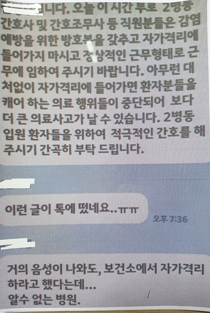 | ▲ 병원 관계자는 "오늘 이 시간부로 2병동 간호사 및 간호조무사 등 직원분들은 감염예방을 위한 방호복을 갖추고 자가격리 들어가지 마시고 정상적인 근무형태로 근무에 임해 주시기 바랍니다"라고 지시 했다 |