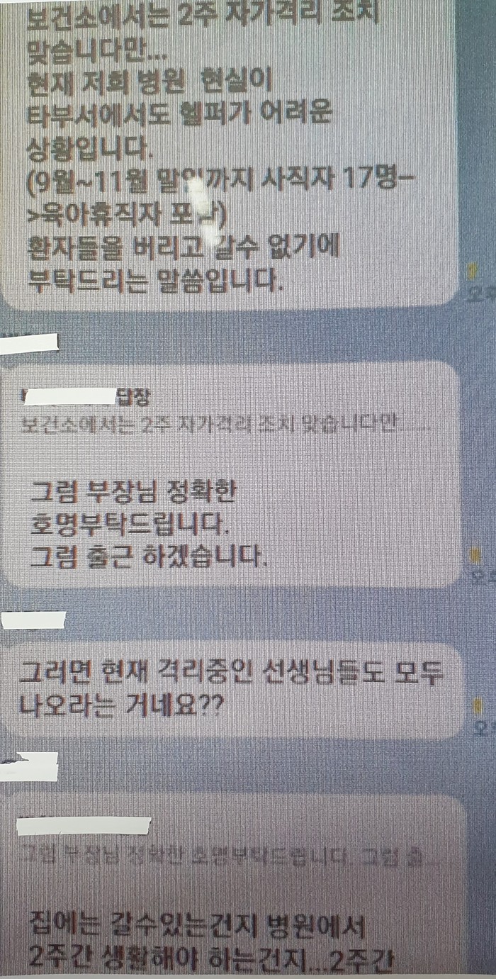 | ▲3개월 동안 사직자(육아포함)가 17명이라 헬퍼가 어려워 격리중인 직원들 근무를 하라는 문자가 있다. |