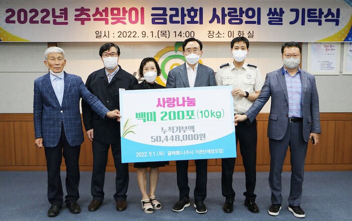 [세계로컬타임즈 강석운 기자] 나주시(시장 윤병태)는 관내 기관단체장 모임인 ‘금라회’에서 추석 맞이 사랑의 쌀을 기탁했다고 1일 밝혔다.