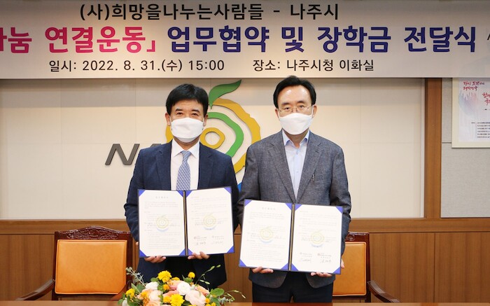 [세계로컬타임즈 강석운 기자] 나주시(시장 윤병태)는 지난달 31일 (사)희망을나누는사람들(회장 김정안)과 저소득 가구 아동·청소년의 장학금 지원 등을 위한 ‘희망나눔 연결운동’ 업무협약을 체결했다고 1일 밝혔다.