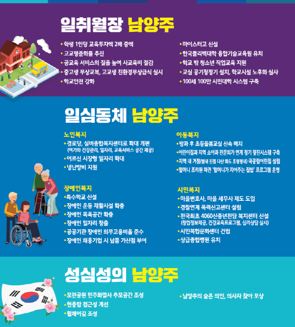 교육정책 '일취월장 남양주', 복지정책 '일심동체 남양주', 남양주 자긍심 높이기 정책 '성심성의 남양주'로 타이틀을 붙였다.
