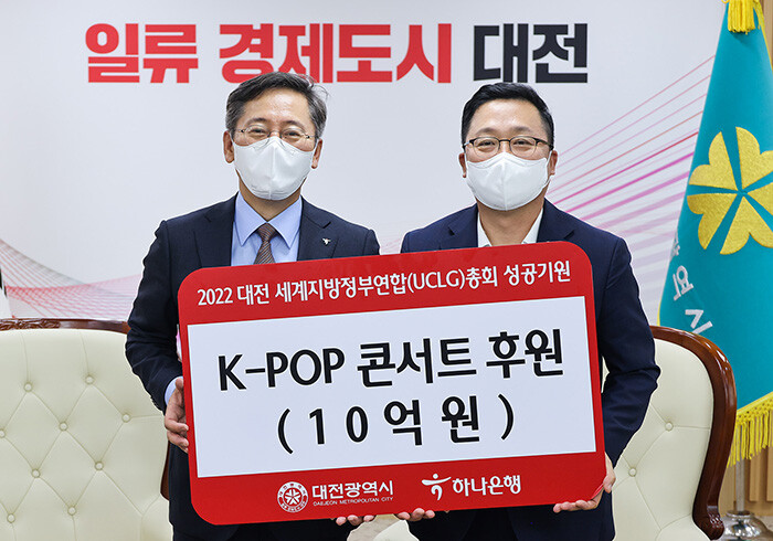[세계로컬타임즈 민순혜 기자] 2022 대전 세계지방정부연합(UCLG) 조직위와 ㈜하나은행은 1일 대전시청에서 ‘하나대전사랑 K-POP 콘서트’개최를 위한 업무협약을 체결했다고 밝혔다.